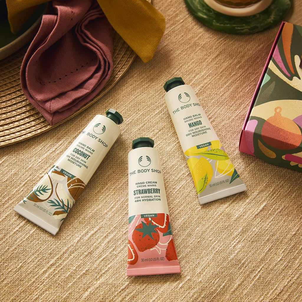 This trio includes fruity mango, tropical coconut, and juicy strawberry. Perfect pocket-sized treats for everyday hand care.